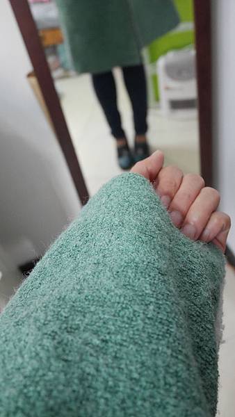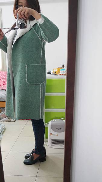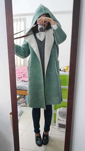 然後第三件的外套 名字是 撞色連帽拼羔羊毛長版外套(湖綠)